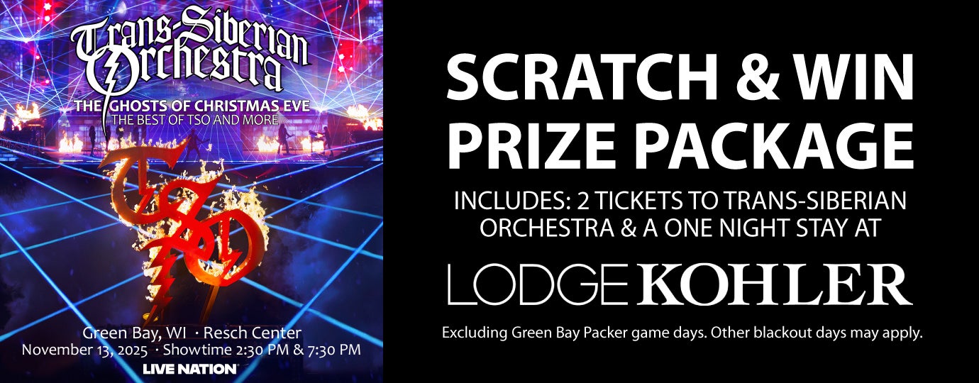 5. Prizes: The Winner(s) of the Campaign (the “Winner”) will receive 2 tickets to Trans Siberian Orchestra, November 11, 2025 at 7:30pm and a one night stay at Lodge Kohler (exclusions apply). This prize package is valued at over $200+. Subject to availability of the facility. Actual/appraised value may differ at time of prize award. The specifics of the prize shall be solely determined by PMI Entertainment Group, Inc. Prizes are not transferable, cannot be redeemed for cash, and cannot be substituted for other items. Any and all prize-related expenses, including without limitation any and all federal, state, and/or local taxes, shall be the sole responsibility of Winner. Acceptance of prize constitutes permission for PMI Entertainment Group, Inc. to use Winner’s name, likeness, and entry for purposes of advertising and trade without further compensation, unless prohibited by law.