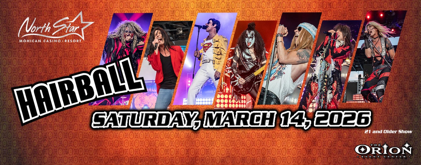 Vocalists Kris Vox, Dave Moody, and Patrick Stone lead the band through a 2+ hour, mind-blowing, and dropdead accurate homage to some of the biggest arena acts in the world. Van Halen, KISS, Motley Crue, Queen, Journey, and Aerosmith are but a few of the acts fans will see brought to life. The Hairball stage becomes an entirely new rock concert before your very eyes countless times throughout the night.